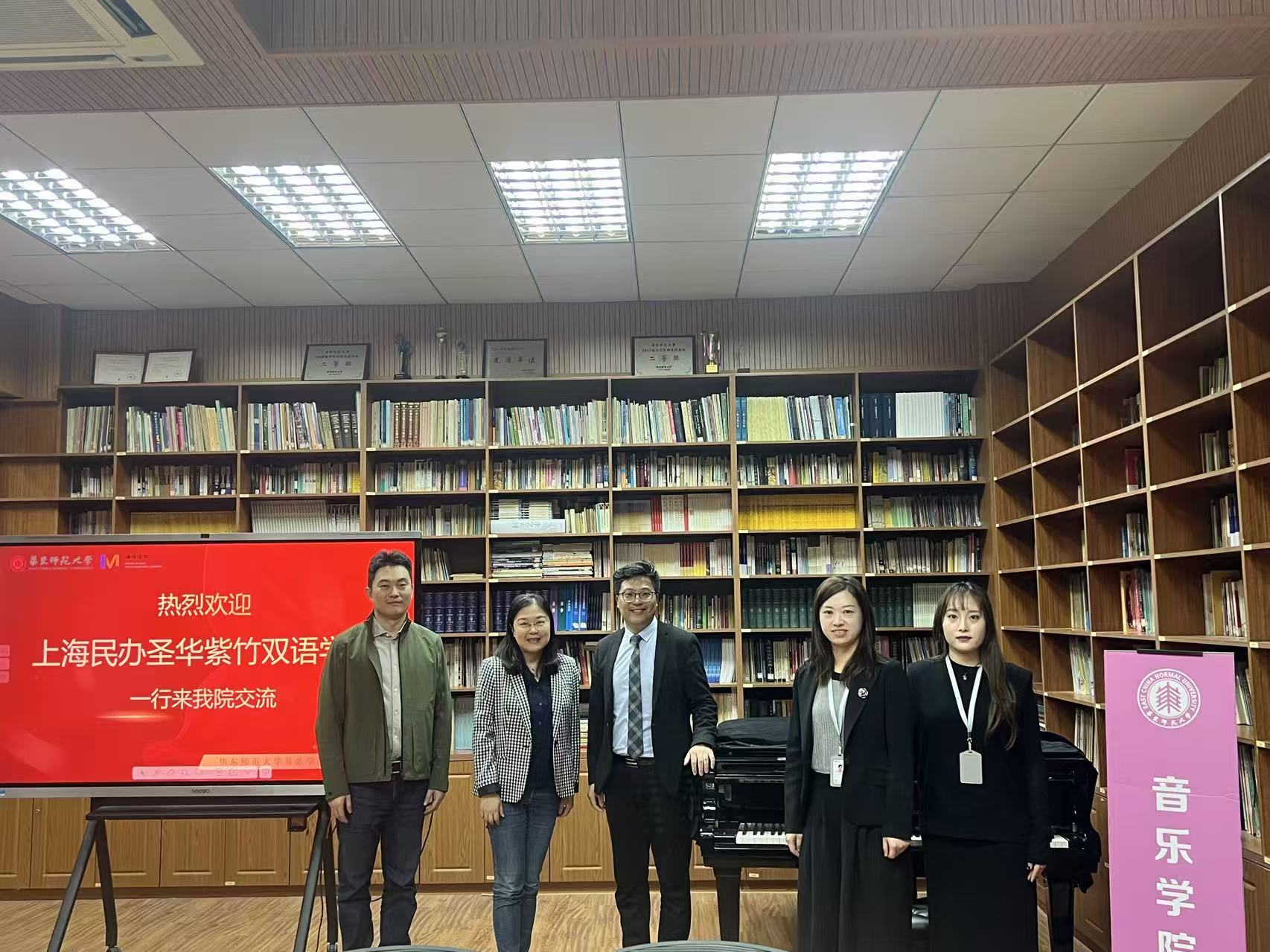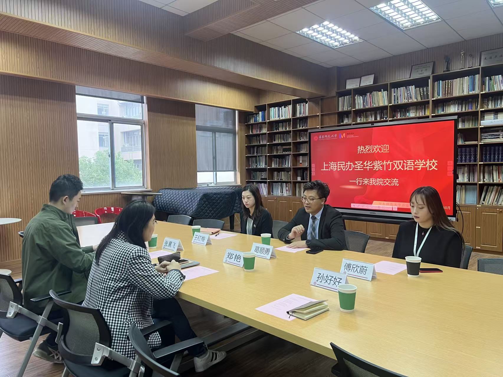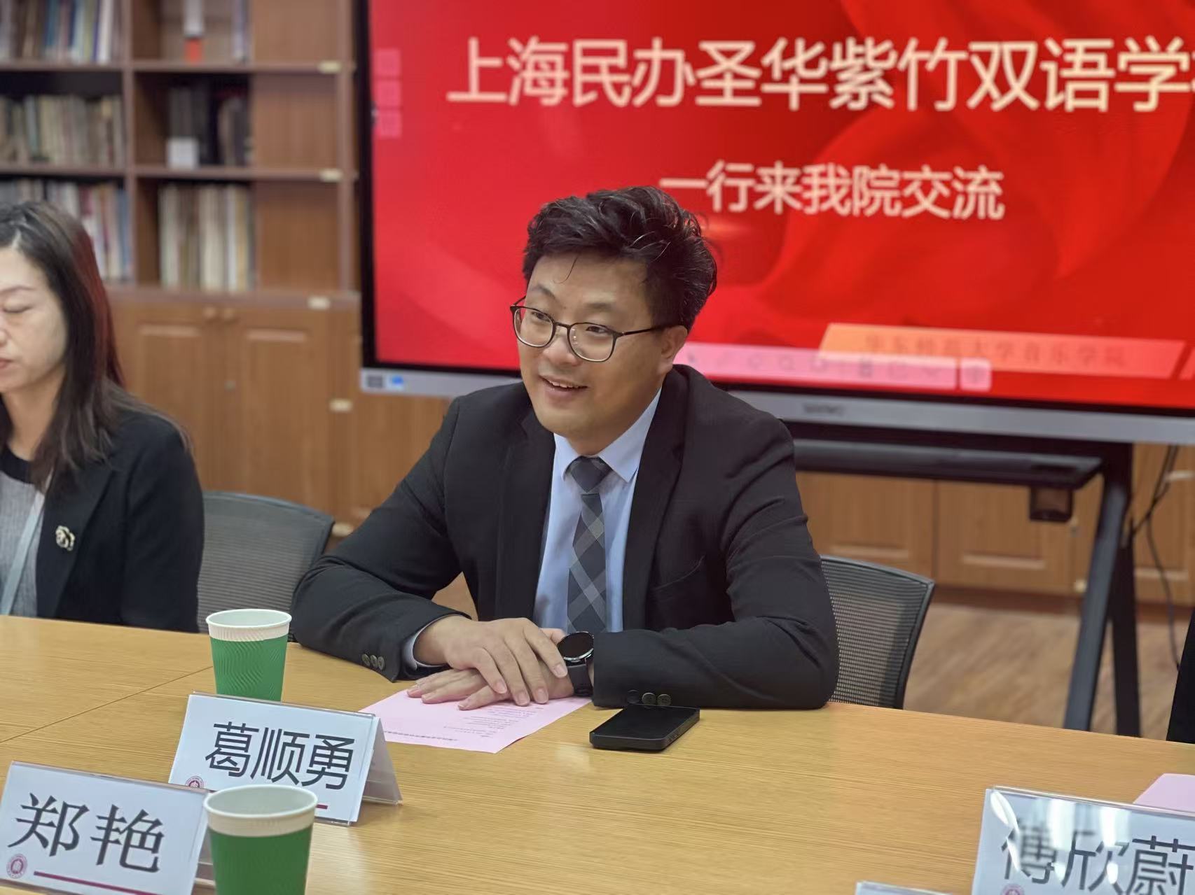 郑艳副院长对葛顺勇校长一行的到来表示欢迎,并向对方介绍了学院历史、师资队伍、国际交流项目等,展示了歌剧实验中心、交响乐团、华韵合唱团三大艺术实践平台近二十余年来在国内外各大音乐厅展演的各类艺术实践成果,分享了我院研究生在华东师大二附中闵行紫竹分校等校外教育教学与艺术实践基地开展教学实践、社团指导、艺术展演的具体实践案例。