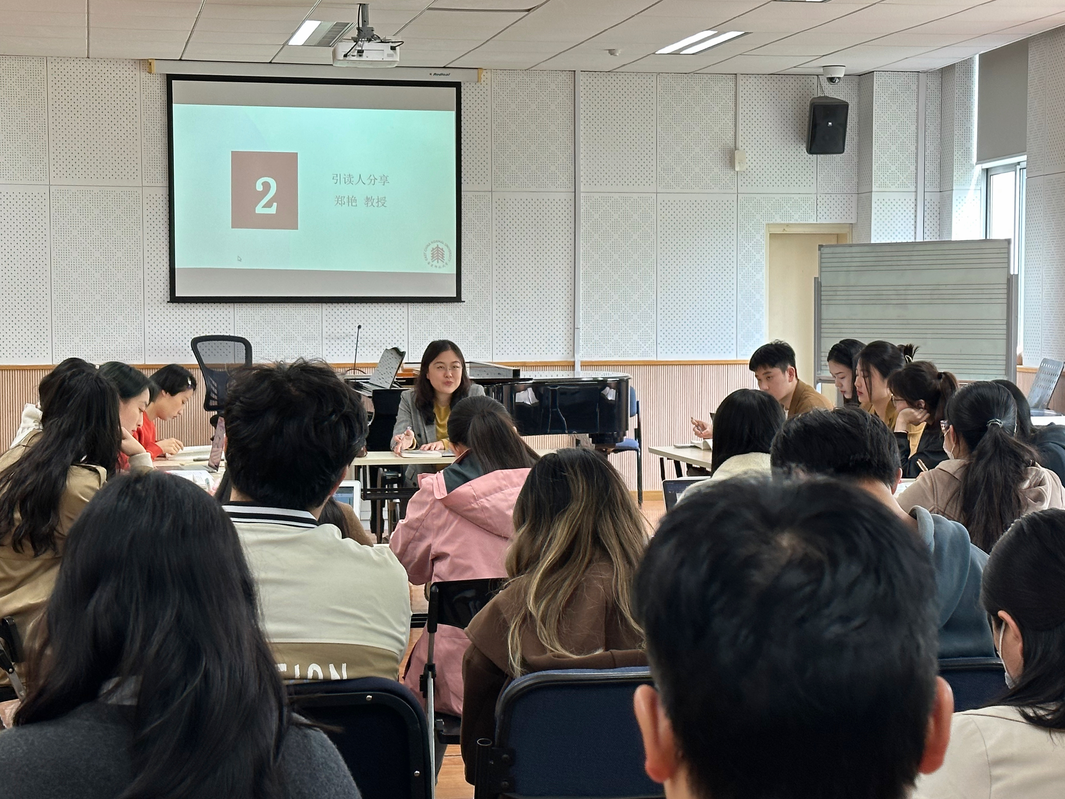 读书会伊始,郑艳教授作为引读人从该书的绪论引入。由于本场读书会面向全校,不仅有音乐学院同学到场,还包括美术学院、物理学院、数学学院、体育与健康学院等院系同学。因此,郑教授首先向大家介绍了该书的作者——姚亚平教授以及该书的写作背景,为大家普及了中国现代音乐的基础知识,使大家能深入参与后续的读书环节。