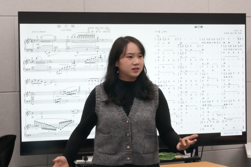 在活动的最后,华东师范大学音乐学院研一学子潘赛菲登台献唱《幽兰操》,悠扬婉转的歌声为这场兼具学术深度与艺术氛围的讲座画上了圆满句点,也让在场师生在旋律中再次感受民族声乐作品的独特魅力。