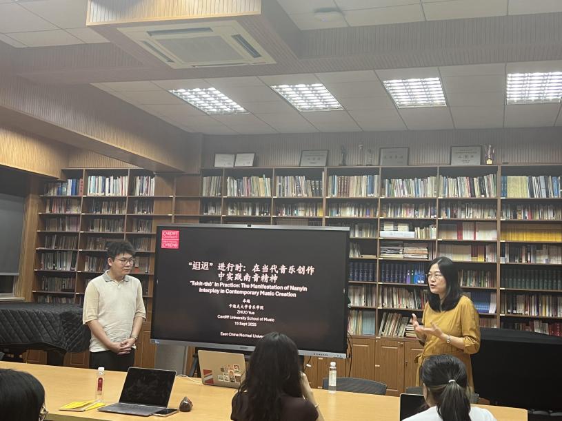 2025年9月15日晚,由华东师范大学音乐学院主办的学术讲座《“𨑨迌”进行时:在当代音乐创作中实践南音精神》于学院350教室顺利举行。讲座由卡迪夫大学音乐学院助理教授、国际关系负责人卓越博士主讲,音乐学院郑艳教授主持。