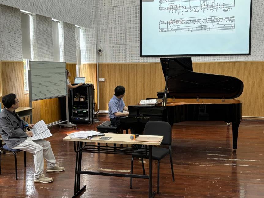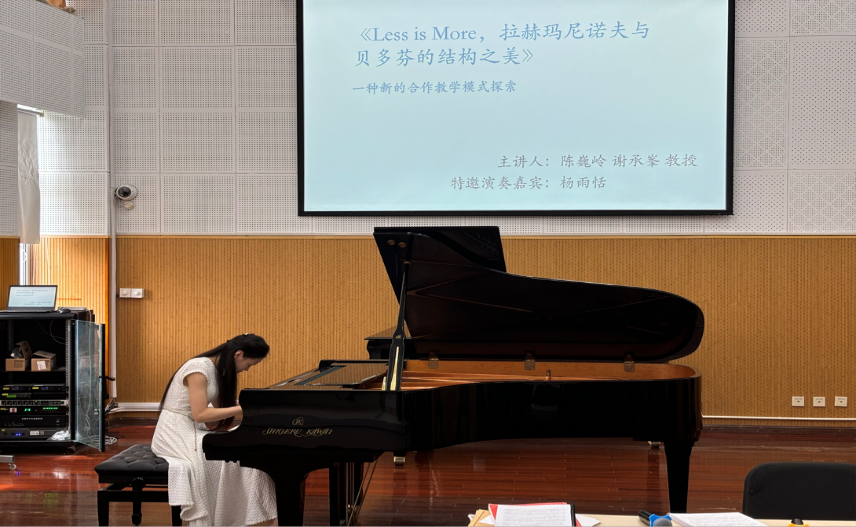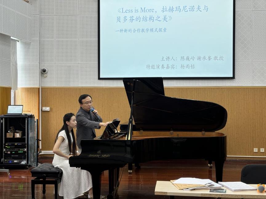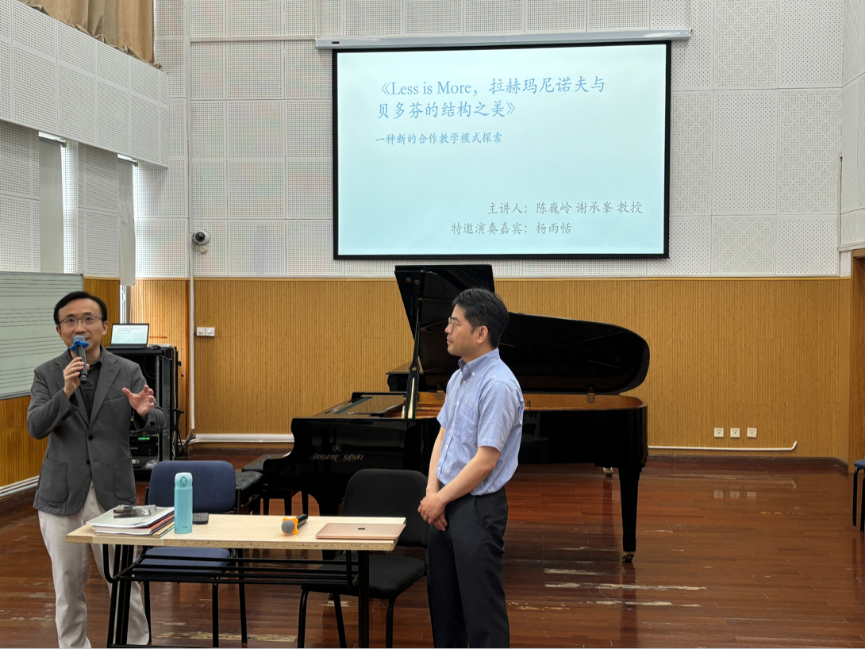 2025年9月24日,上海音乐学院附中教授、附中钢琴科主任陈巍岭教授应邀在华东师范大学音乐学院举办了一场主题为“《Less is More,拉赫玛尼诺夫与贝多芬的结构之美》--一种新的合作教学模式探索”的学术交流讲座。本次讲座为华东师范大学2025年度第89场百场校级学术讲座,由华东师范大学音乐学院键盘系承办,键盘系主任谢承峯教授主持。该讲座其新颖之处在于采用了创新的合作讲学模式,由陈巍岭、谢承峯两位教授共同主讲,对于贝多芬与拉赫玛尼诺夫的音乐作品轮流从不同的角度切入,以启发式教学的方式,附以具体的作品演奏实例,带领听众深入探寻音乐创作的奥秘。